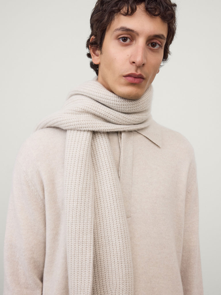 A sumptuous accessory, the Marseille scarf is crafted in heavy knit, fisherman-ribbed cashmere with a chunky hand feel. The tubular construction with cinching ribbed trims envelopes the neck and shoulders, adding comfort and warmth throughout the colder months.