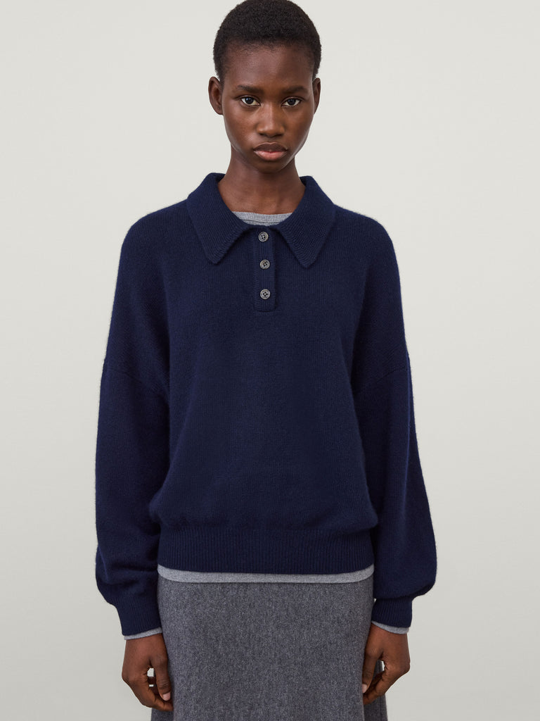 A new seasonal silhouette, the Etta sweater is crafted in our signature mid-weight, plain knit cashmere. The relaxed fit, hip-length silhouette features a buttoned polo shirt neck, dropped shoulders, full-length sleeves and a ribbed hem.