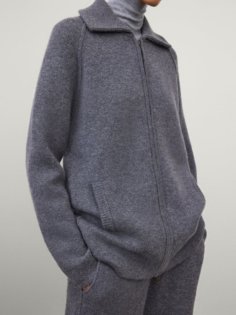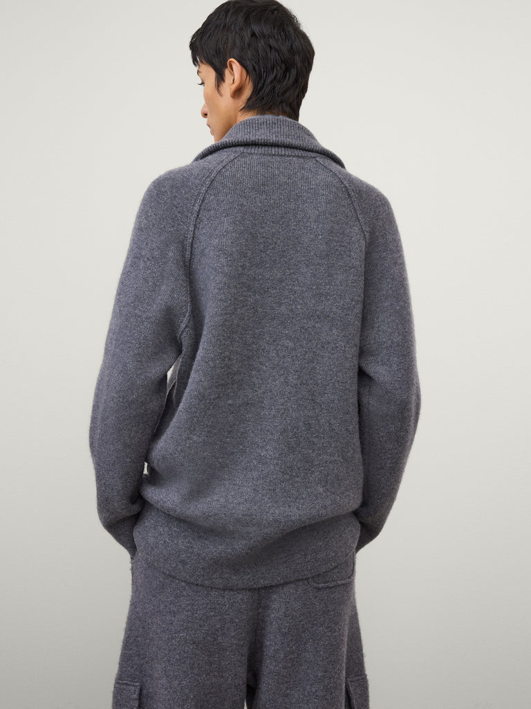 A sumptuous new piece, the Gardenia zip cardigan is crafted in structured double face cashmere to generous proportions. The regular fit, cocooning silhouette features an enlarged collar, raglan shoulders, a two-way zip fastening, full-length sleeves, welt pockets and ribbed trims.