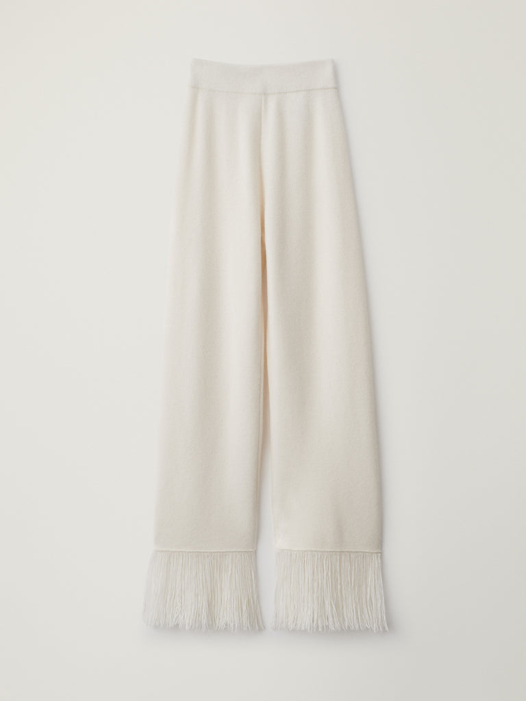 A new trouser silhouette, the Kiera trouser is crafted in softly textured honeycomb knit cashmere. The straight, wide leg silhouette sits comfortably at the waist and is detailed with fringes at the hem which length can be adjusted by cutting.
