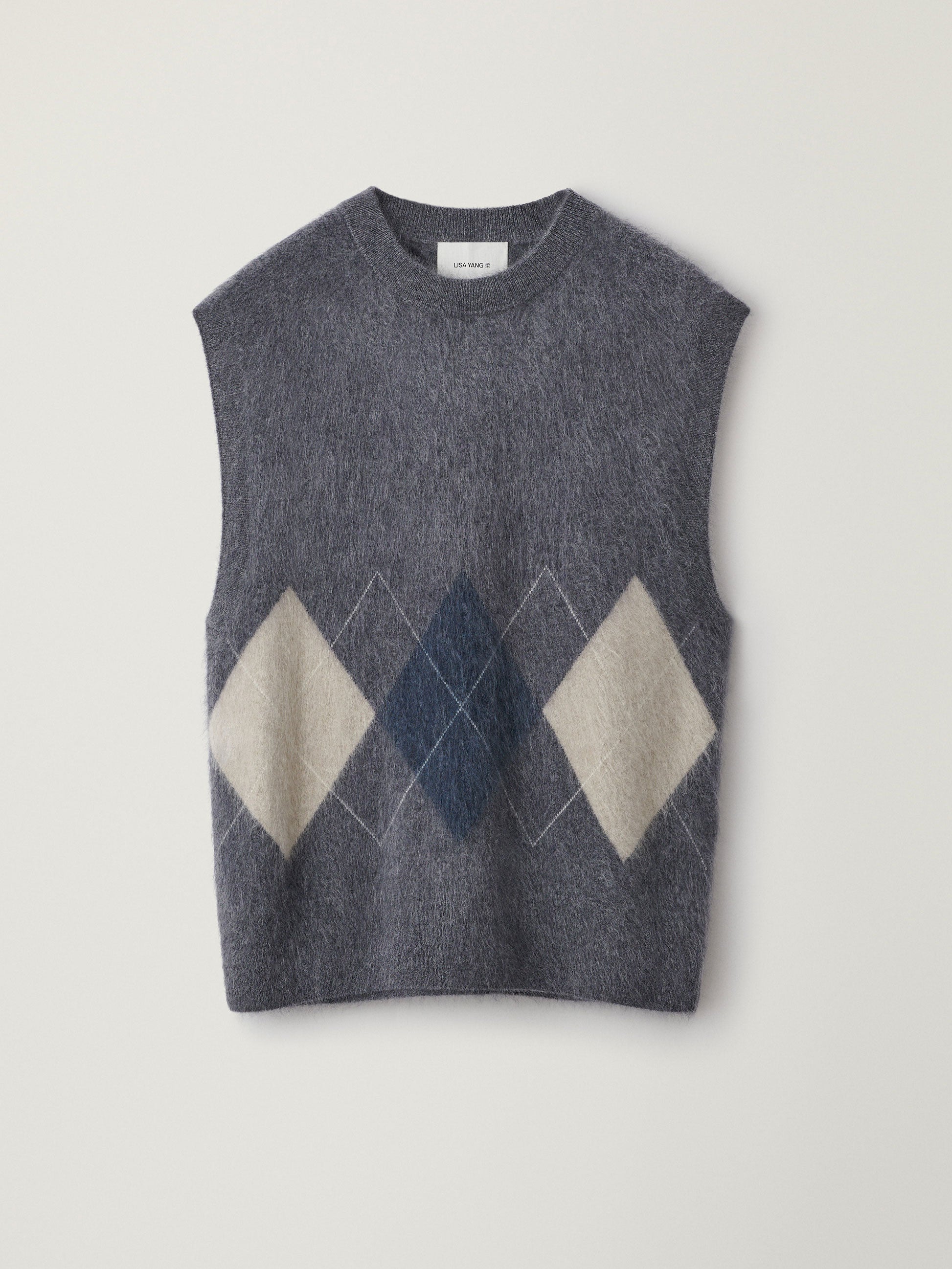 A staple piece, the Dennis vest is reworked in our signature brushed cashmere with a graphic Argyle pattern. The relaxed fit silhouette features a crew neck and ribbed trims for a structured finish.