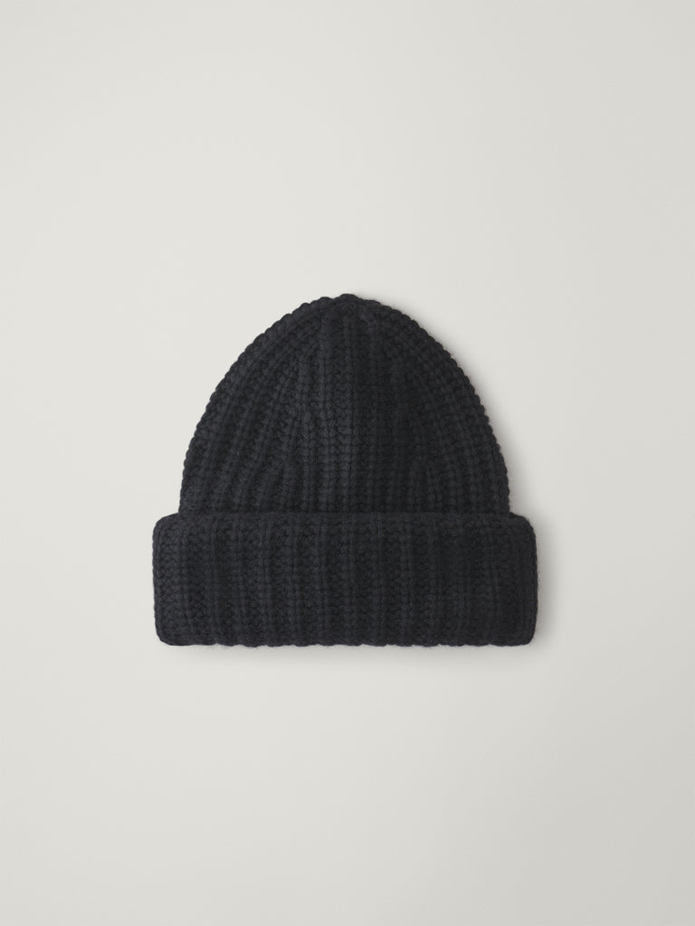 In a chunky, 3-gauge ribbed plain knit silhouette, the Beatris beanie has a triple rolled edge that can be worn folded or extended.