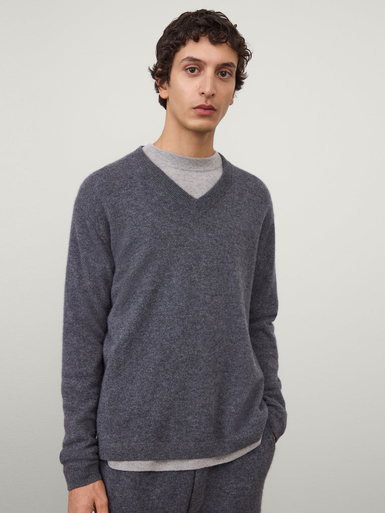 An everyday v-neck, the Clayton sweater is knitted in our seasonless, mid-weight cashmere for perennial wear. The regular fit, straight silhouette is framed by a v-neck, full-length sleeves and ribbed trims finished with a split bottom hem side detail.