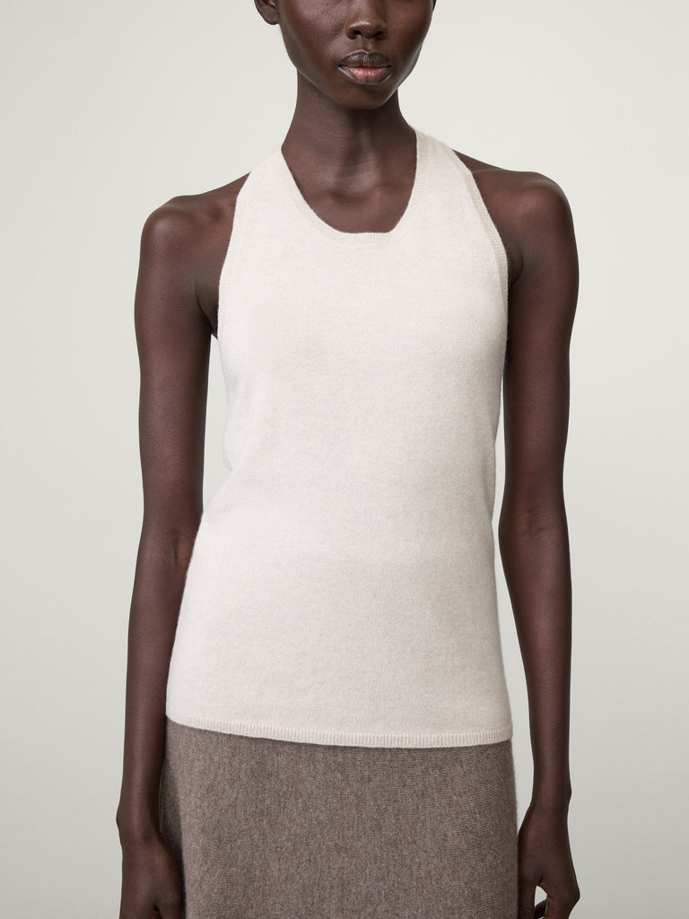 A new seasonal exploration, the Florencia top is crafted in our signature mid-weight, plain knit cashmere. The regular fit, sleeveless silhouette is defined by its halter neck design and low back, and finished with a ribbed hem that ends at the hips.