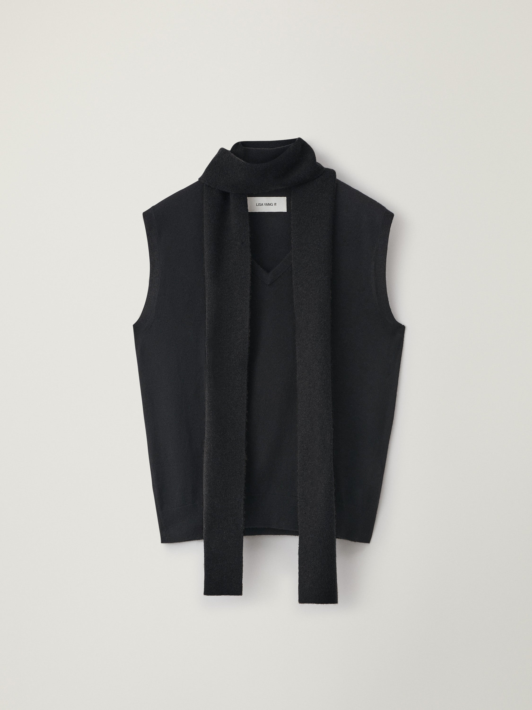A new day-to-evening silhouette, the Lauri scarf top is crafted in our finest, most delicate cashmere knit. The regular fit, cropped silhouette features a v-neck with a scarf attached at the nape, a sleeveless vest design and a ribbed hem.