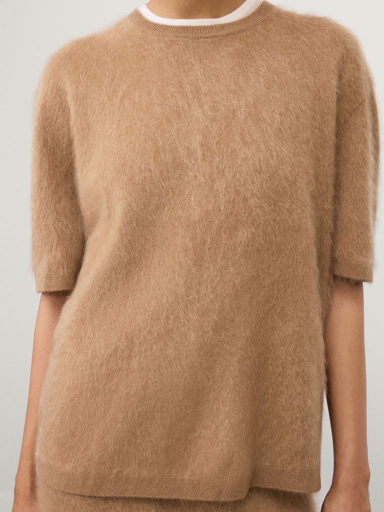 A new spring silhouette, the Maren sweater is knitted in our signature brushed cashmere that is cloud-like to the touch. The relaxed fit, hip-length silhouette is complete with a crew neck, dropped shoulders, short sleeves and ribbed trims.