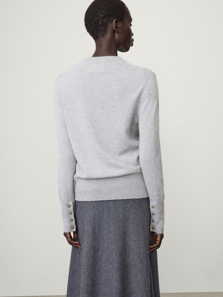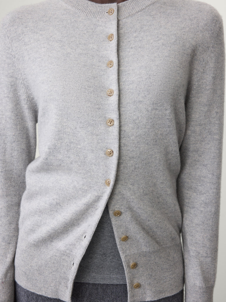 A new seasonal silhouette, the Nellia cardigan is crafted in mid-weight, plain knit cashmere to a feminine expression. The regular fit, straight silhouette features a round neck, a front button closure and full-length sleeves, with buttoned cuffs and inside-out seam details to punctuate the look.