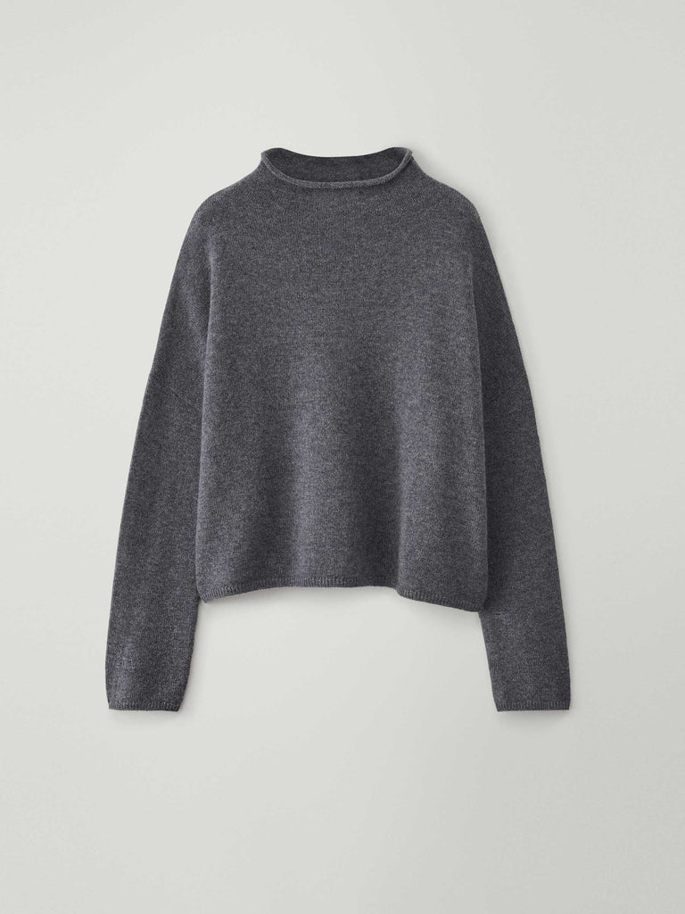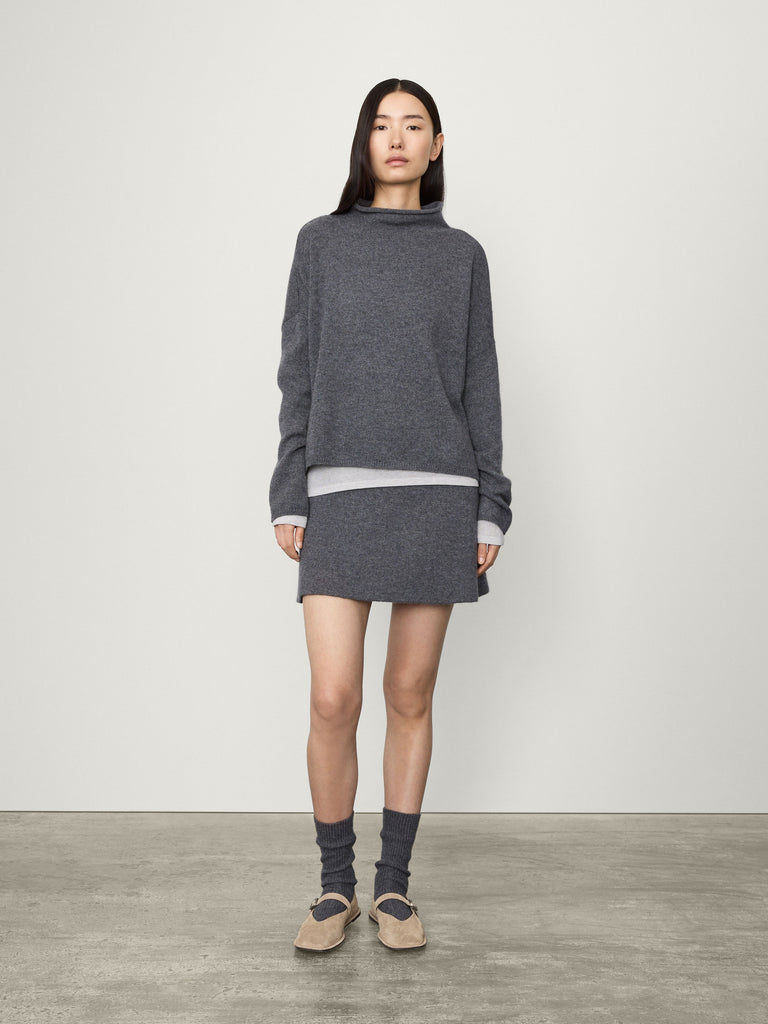 A plush top layer, the Sandy sweater is crafted in rich, heavy knit cashmere to wide proportions. The enveloping silhouette creates effortless drapes at the front and back, made sublime by the generous rolled mock neck and relaxed dropped shoulders.