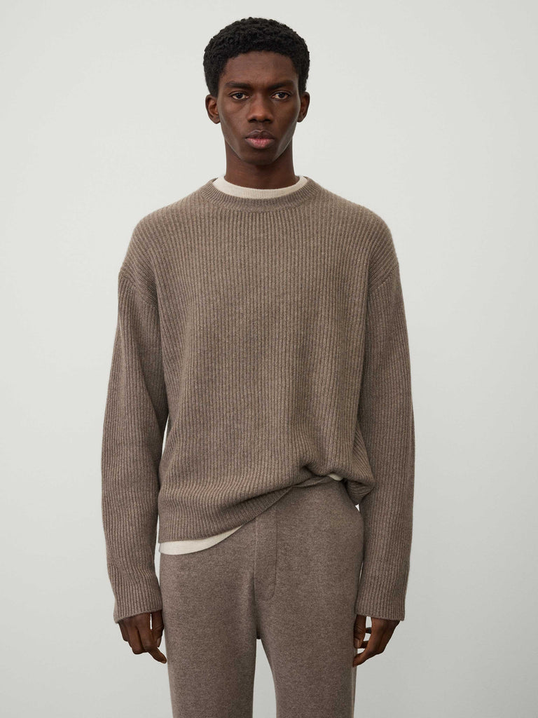 A casual ribbed sweater, the William sweater is knitted in our chunky, heavy knit cashmere with a sturdy hand feel. The relaxed fit silhouette features a round neck, dropped shoulders, full-length sleeves and ribbed trims, with a contrast ribbed pattern at the back lending it a graphic edge.