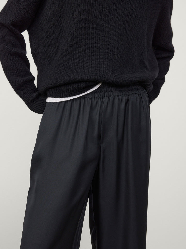 In woven silk twill, the wide leg trouser has a relaxed full-length fit through the leg, with a mid-rise, elasticated pull-on waistband. Pair with the combining tops from the woven silk edit for a complete look, or with pieces in cashmere from across the collection.